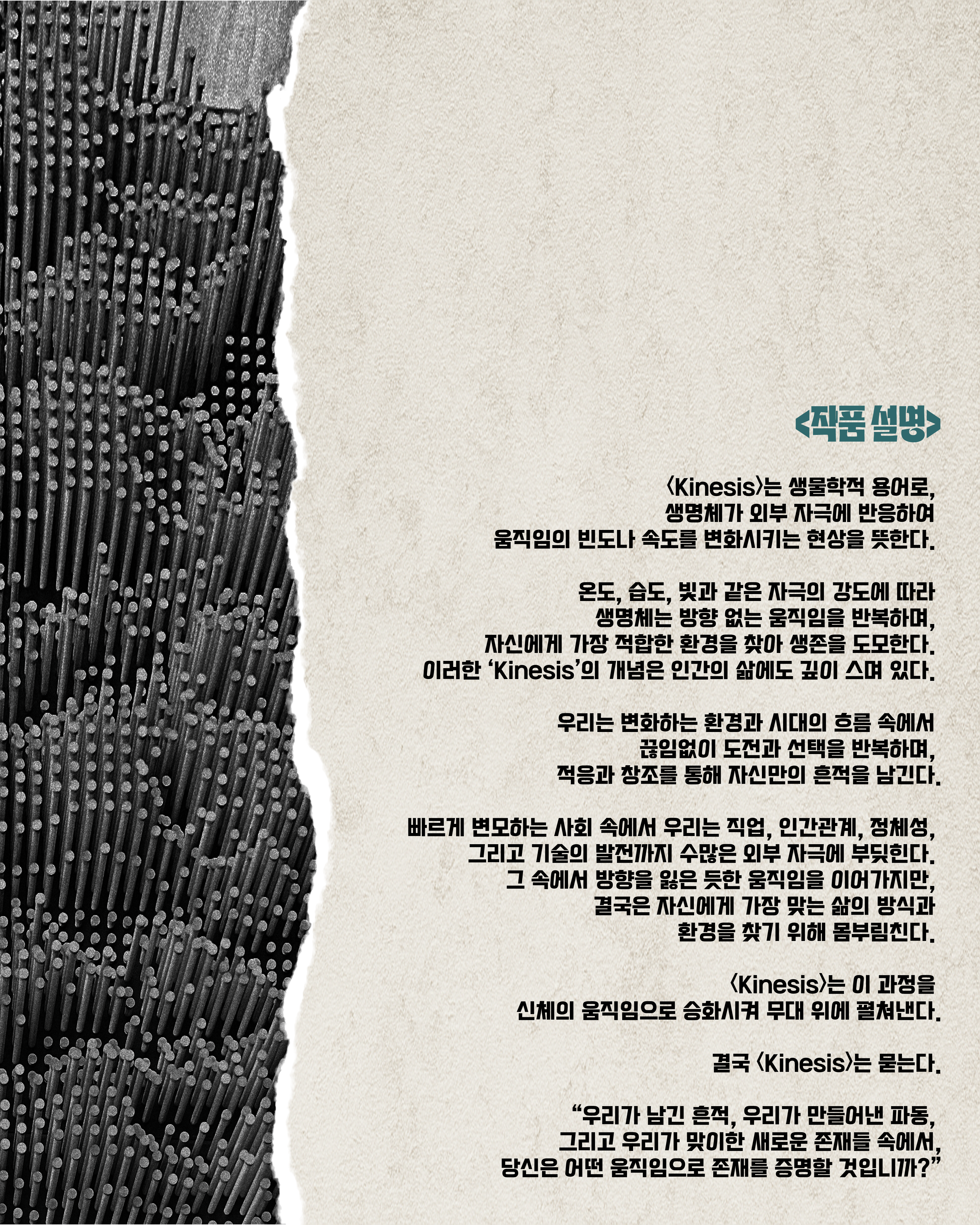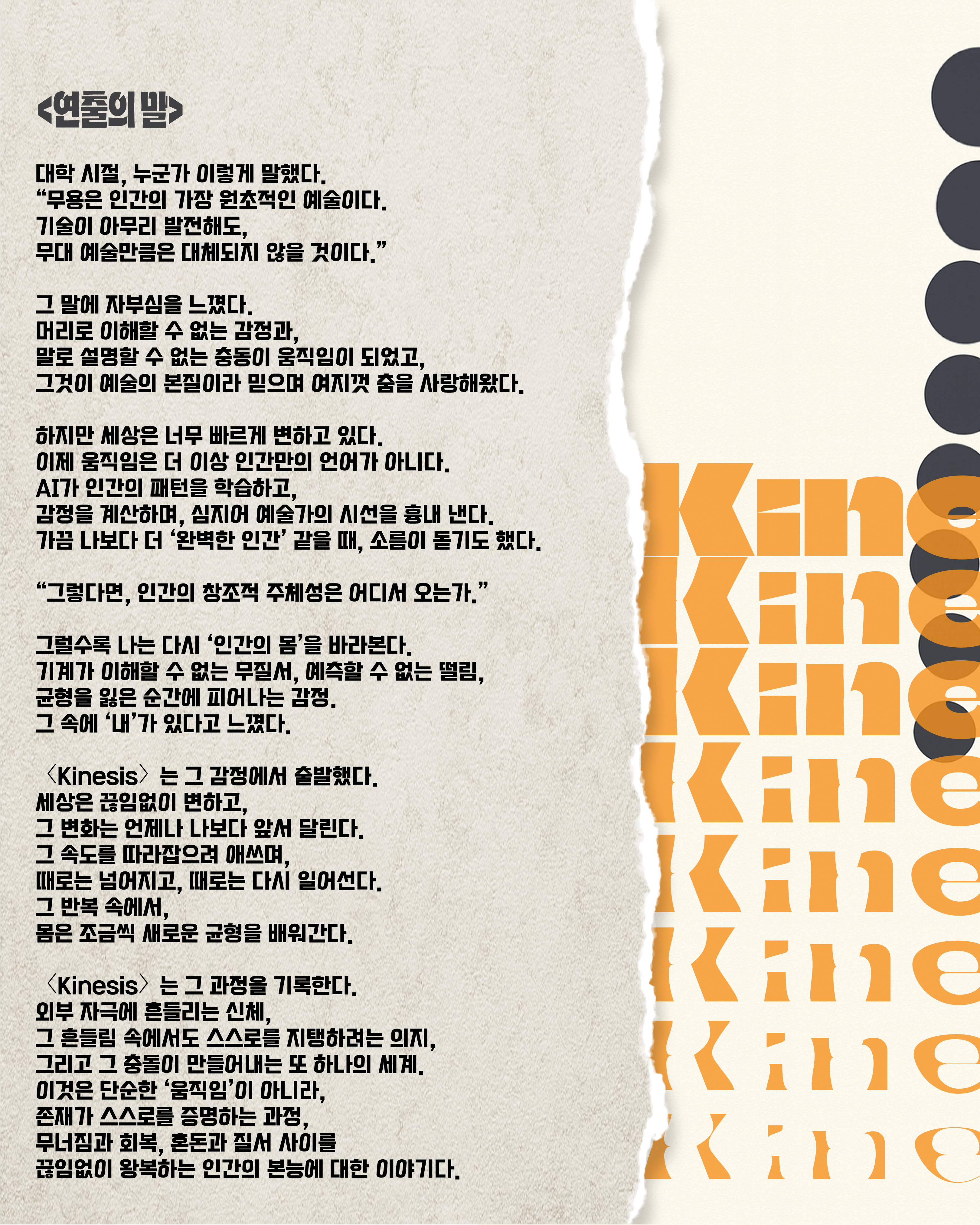 이번 〈Kinesis〉는 그간의 실험적 연출 경험을 집약한 무대이자