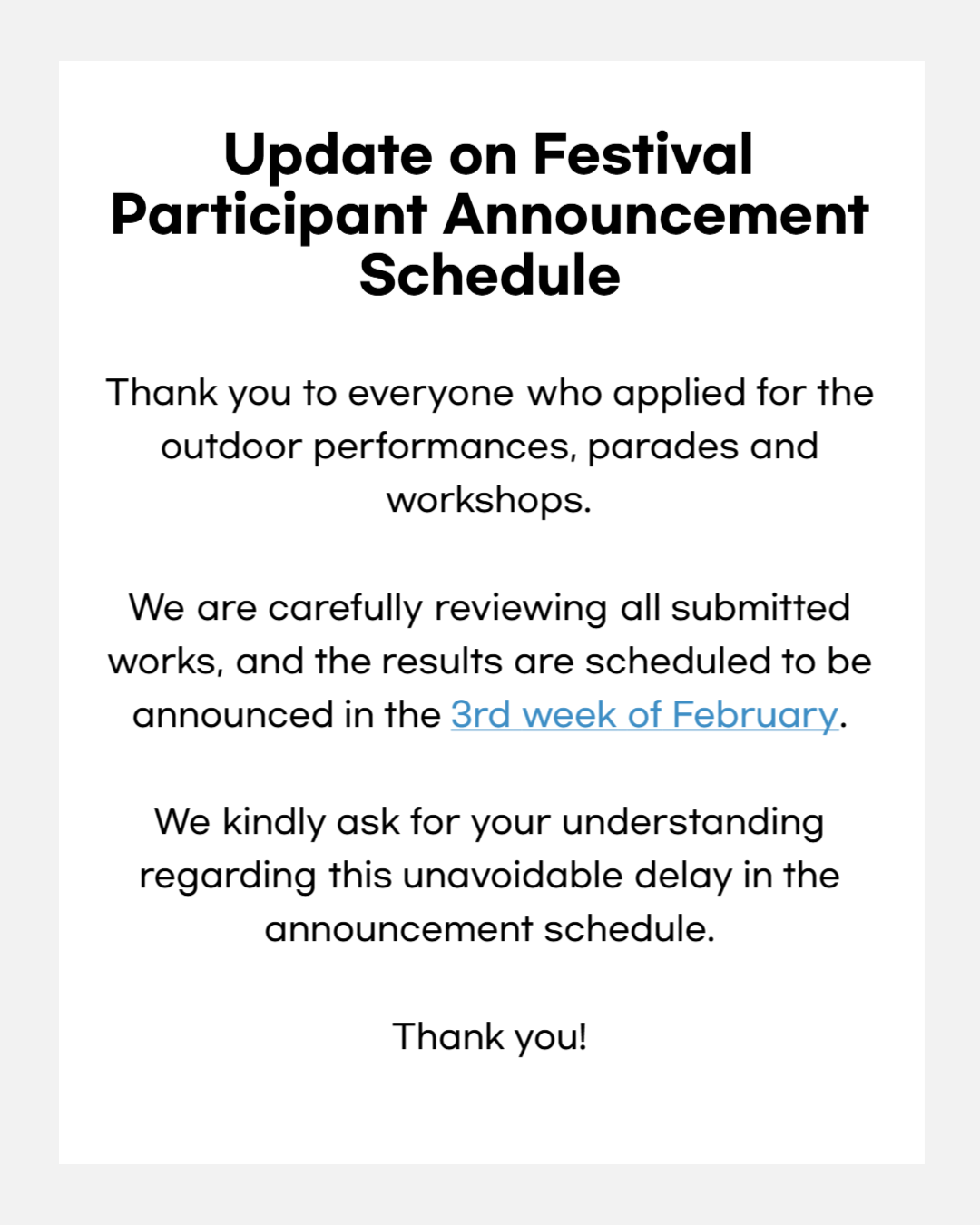 Notice of Delay in Festival Participant Announcement